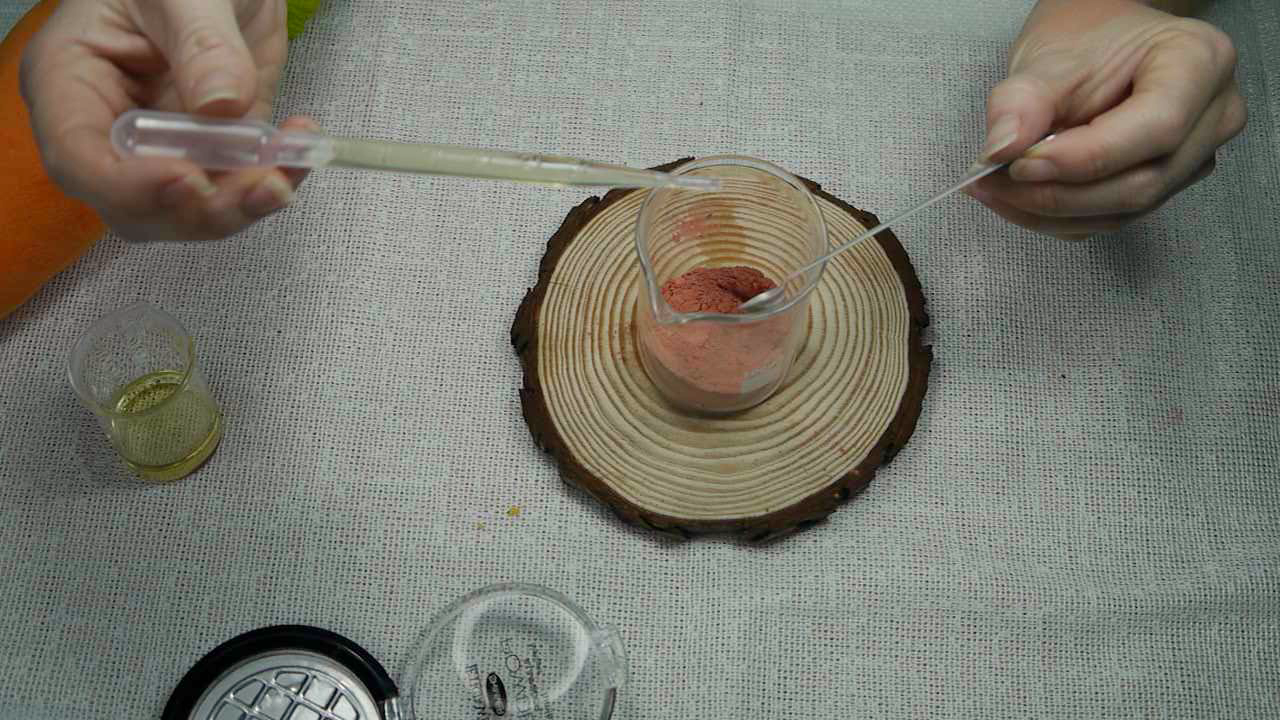 Una vez molido, echamos en un vasito un chorrito de aceite de argán junto con la vitamina E y el aceite esencial. Mezclamos muy bien. Podemos usar una pipeta o jeringuilla estéril para ir agregando el aceite a los pigmentos poco a poco. Hasta alcanzar una masa a la que se pueda dar algo de forma.