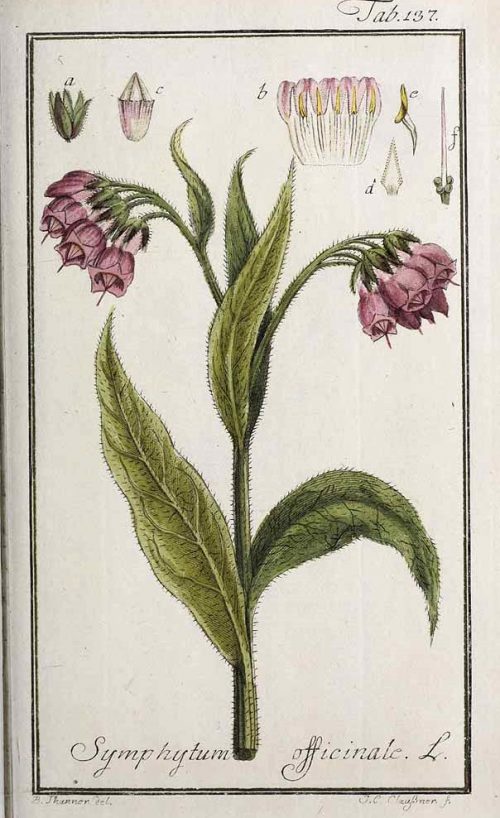 La planta fresca o compresas con la infusión de consuelda ayuda a mejorar torceduras, esguinces o fracturas. Y propicia la reparación de huesos y ligamentos. En forma de compresa también podemos aplicarlas en cicatrices, llagas o pezones agrietados. Mejor infusionar y no cocer la planta, aunque sea la raíz, para no descomponer el mucílago y los taninos. O incluso macerar la planta en agua fría simplemente. Para estos casos siempre es mejor la raíz.