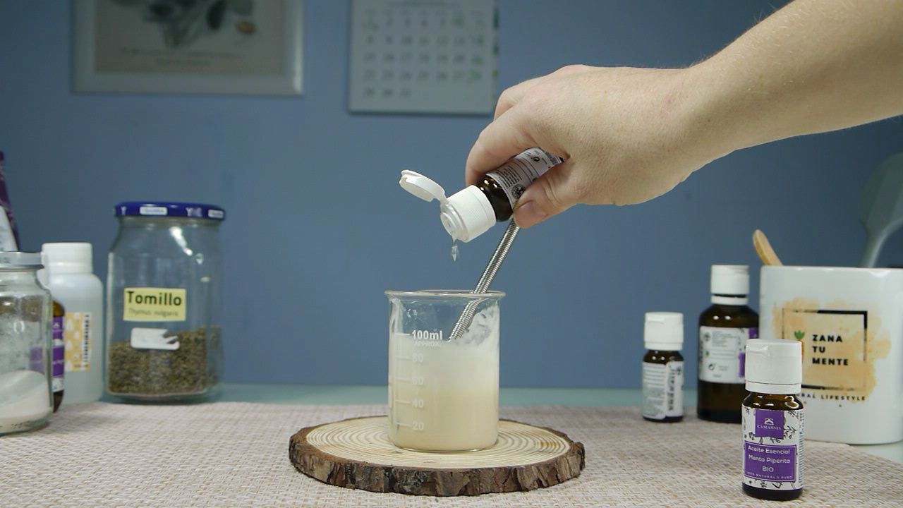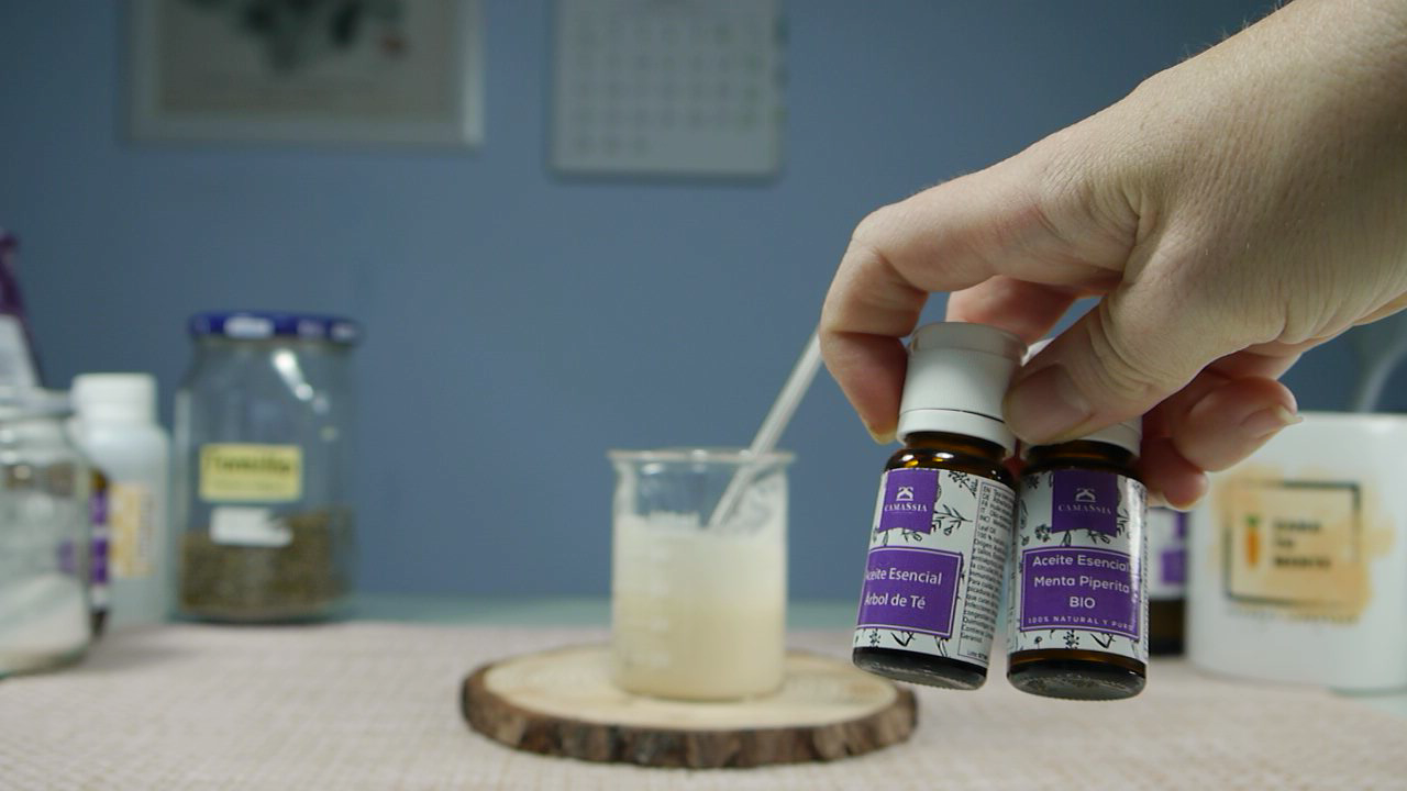 El aceite esencial es opcional, aunque recomiendo añadirselo para aportar un buen aroma y más intenso. Yo escogí el del árbol del té, ya que tiene propiedades antisépticas y antibacterianas, eliminando el mal olor. Y el de menta piperita, que refresca, es antiséptico y disminuye el picor.