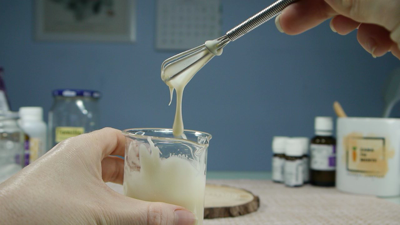 En otro recipiente medimos el aceite de coco fraccionado con el emulsionante, y tendríamos la fase oleosa. Llevamos ambas fases al baño maría hasta que se disuelva todo. Luego vertemos la fase acuosa sobre la oleosa mientras batimos con intensidad, hasta que esté a temperatura ambiente.