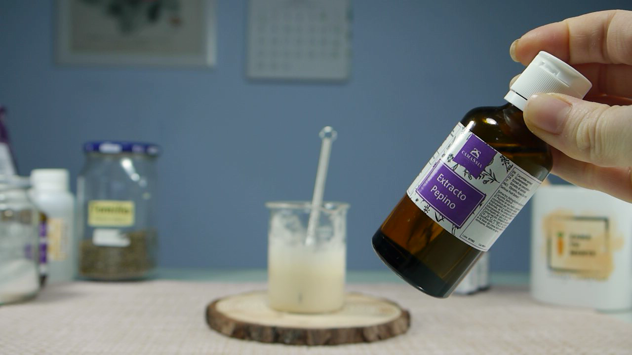 Luego añadimos a la emulsión fría el extracto de pepino, los aceites esenciales y el conservante hidrosoluble. Asegurándonos que tenga un pH alrededor de 5 y que el conservante que usemos, actúe en ese pH. Una vez mezclado todo, lo podemos envasar.
