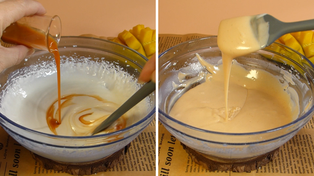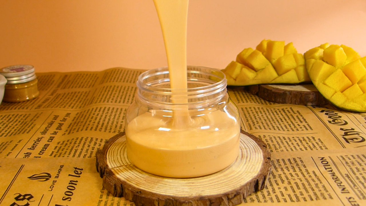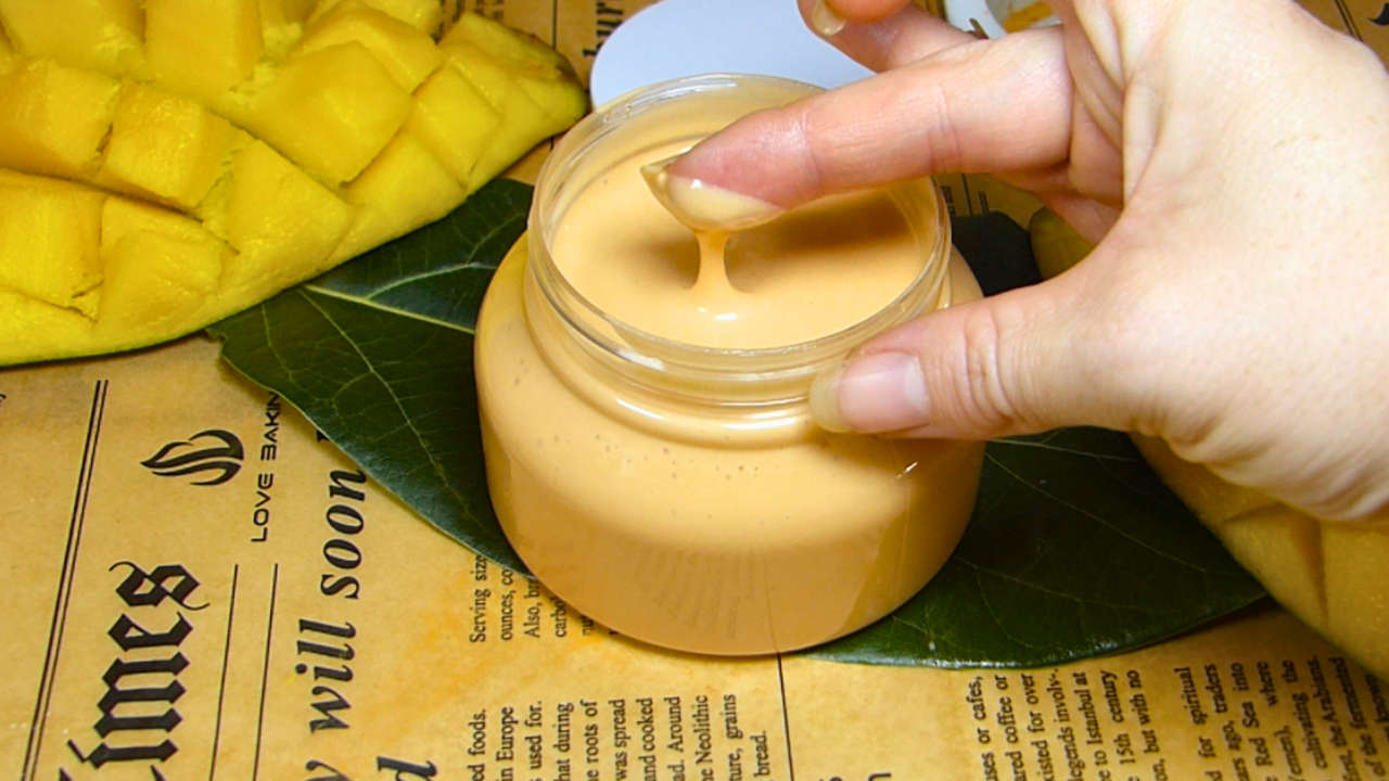 -Aroma de mango: El aroma natural de mango se obtiene generalmente por destilación o extracción de compuestos volátiles del fruto o de sus componentes (como la pulpa o la piel). A diferencia de las fragancias sintéticas, este tipo de aroma conserva la autenticidad del mango y es más respetuoso con pieles sensibles, además de no contener disruptores hormonales. Y el aroma tropical estimula el ánimo, reduce el estrés y aporta una sensación de frescura y bienestar. Añadí 30 gotas de aroma natural.