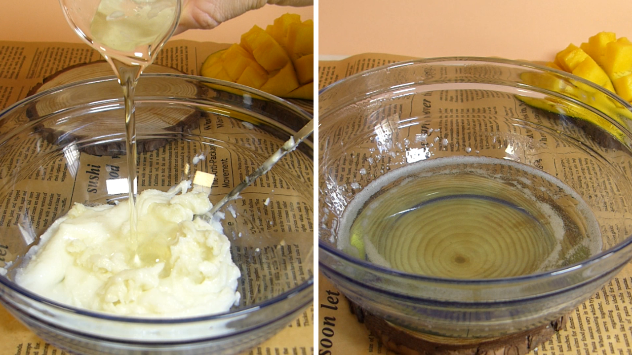 Funde las mantecas y aceites en un recipiente resistente al calor, al baño maría. Fundiremos y mezclaremos la manteca de mango, de oliva, el aceite de almendras y el aceite de coco. Hasta que esté completamente líquido. Luego lo dejaremos enfríar para más tarde, batirlo intensamente.