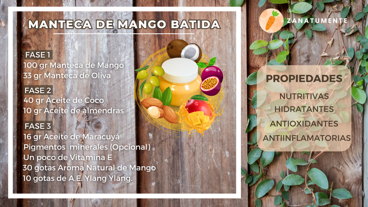 Si tu piel pide hidratación profunda y tu cabello necesita un rescate nutritivo, esta elaboración es para ti. La manteca batida de mango no solo tiene una textura suave y aireada que se funde al contacto, sino que está cargada de beneficios que la convierten en un imprescindible de la cosmética natural.