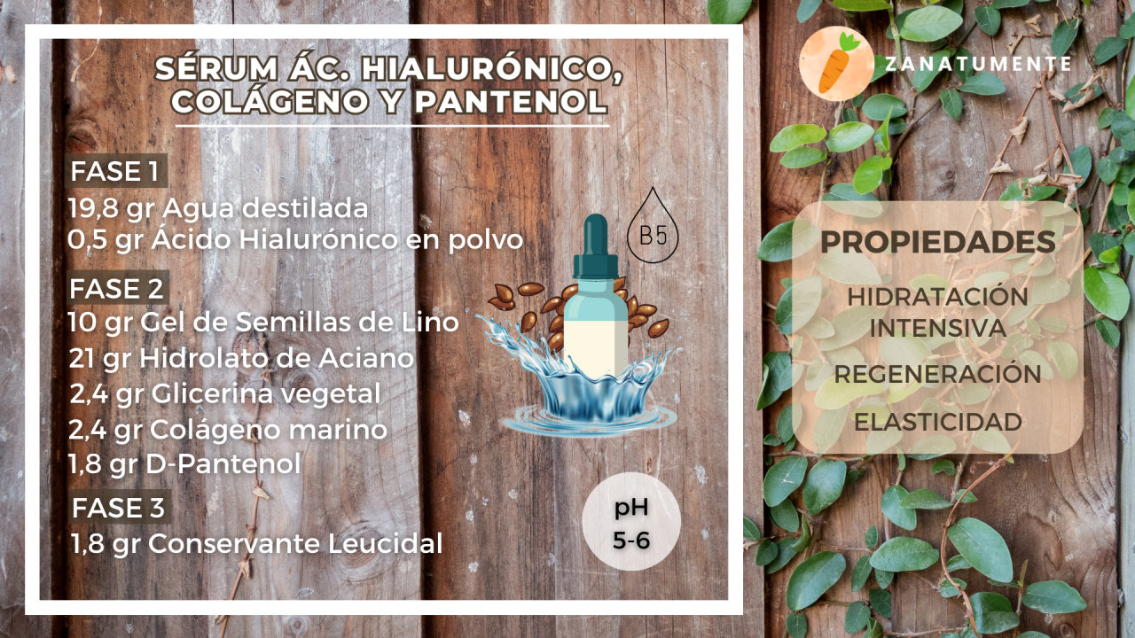 Descubre como elaborar tu propio sérum de hidratación intensiva con ácido hialurónico como protagonista. Pero además llevo otros activos cosméticos como el colágeno y el pantenol.