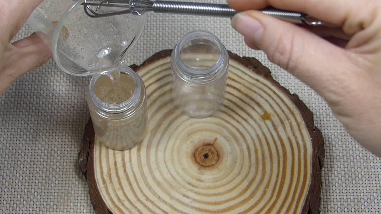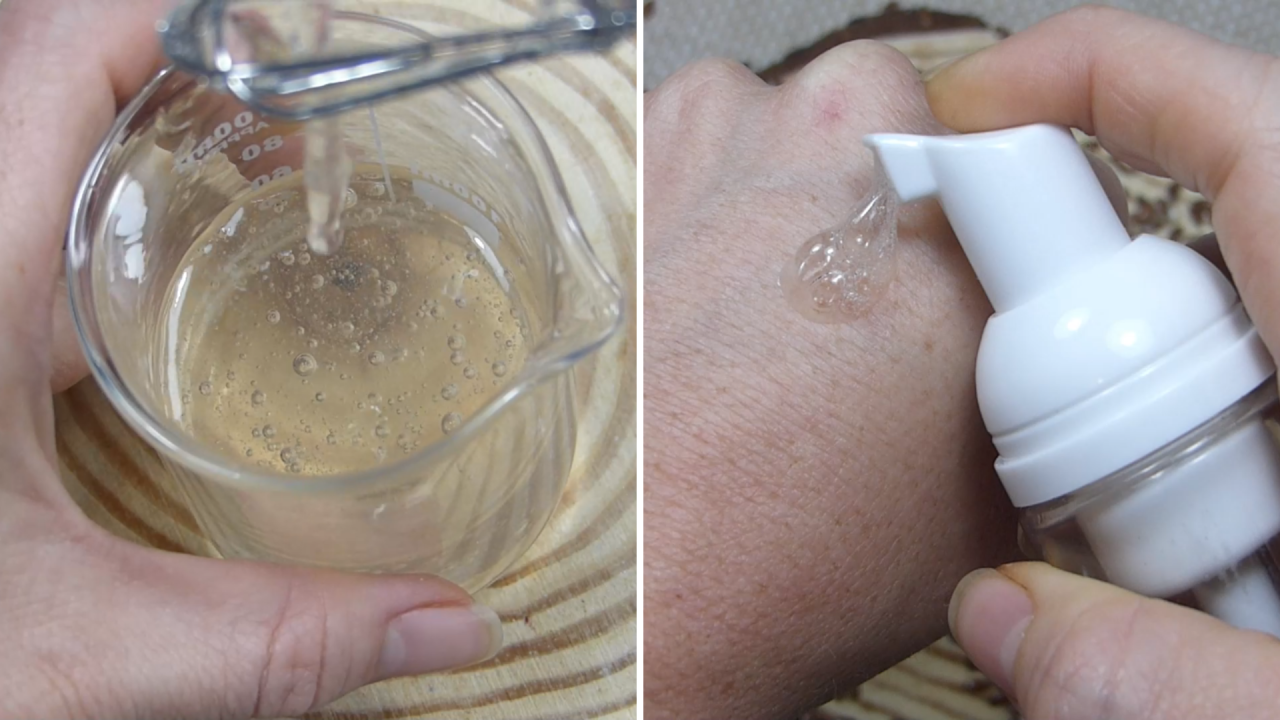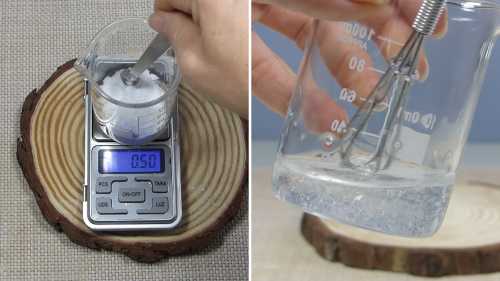 Cuando ya tengamos listo nuestro gel de ácido hialurónico, le vamos a añadir el hidrolato de aciano y la glicerina vegetal. Luego le añadimos los demás activos y la parte de gel de lino que le tenemos que agregar. Y lo dejamos todo mezclado homogéneamente.