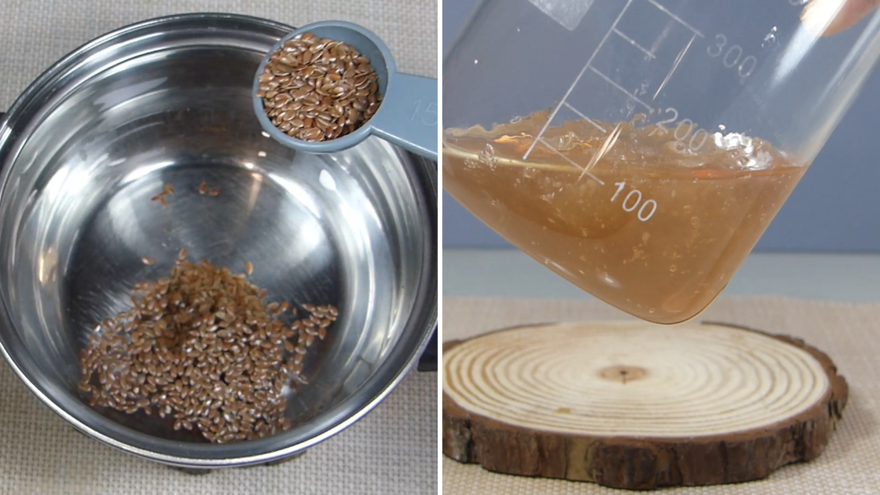 Pero básicamente para elaborarlo en esta receta usamos un vaso de agua con 3-4 cucharadas de semillas de lino. Y lo dejamos hervir 10 minutos aproximadamente hasta que se forme el gel. Con estas cantidades te va a sobrar bastante cantidad de gel de lino, pero ni se te ocurra tirarlo. Lo podemos pesar, añadir conservante natural según su peso y usarlo directamente en la piel o el pelo. Si prefieres no conservarlo puedes hacer menor cantidad.