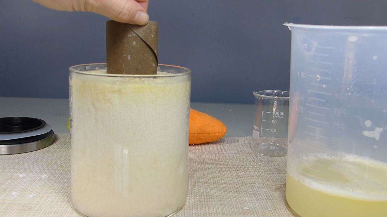 El típico cuchillo de cortar el pan puede servirnos. Una vez que tenemos el rollo de papel a la medida correcta, vamos a preparar el líquido.
